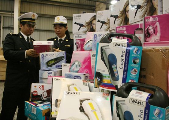 图为:宁波海关查验关员正在核对侵权美容美发工具侵权商标 项艳群/摄 近日,宁波海关查获约1.7万件侵权美发工具。这批货物涉案价值约35万元人民币,侵犯了“WAHL”、“MOSER”、“Braun”等品牌的知识产权。 (项艳群 摄影报道)