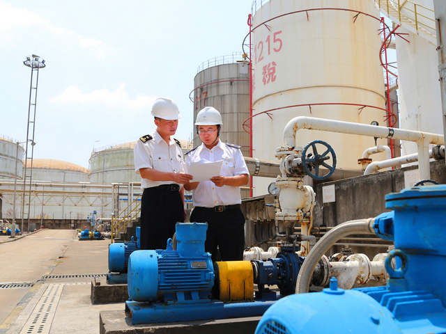 图为浦东检验检疫局同浦东海关的执法人员联合对进口保税散装危险化学品实施现场监管和检查