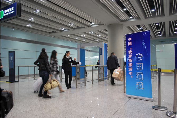 3月22日,来京参加中国“俄罗斯旅游年”开幕式演出活动的137名演职人员由俄罗斯抵京。首都机场海关旅检部门设置专门通道,派专人引导演职人员通关,并根据相关要求为该团组人员及所携带的演出器材提供通关便利。(李振益 摄影报道)