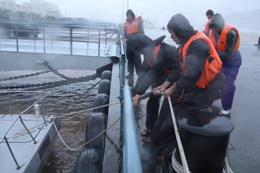 8月8日,第11号强热带风暴“海葵”正面袭击宁波。宁波海关大榭海上缉私基地切实加强24小时值班制度,严格落实抗台风责任制。同时,成倍加固缉私码头和船艇的缆绳、钢丝绳;增加碰垫;根据浮码头设计结构和船坞特点,调整缉私艇靠泊方式;并制定码头和船坞防台风的专门方案。
