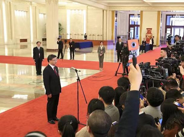 图为:倪岳峰在全国两会“部长通道”接受采访 孙霞云/摄